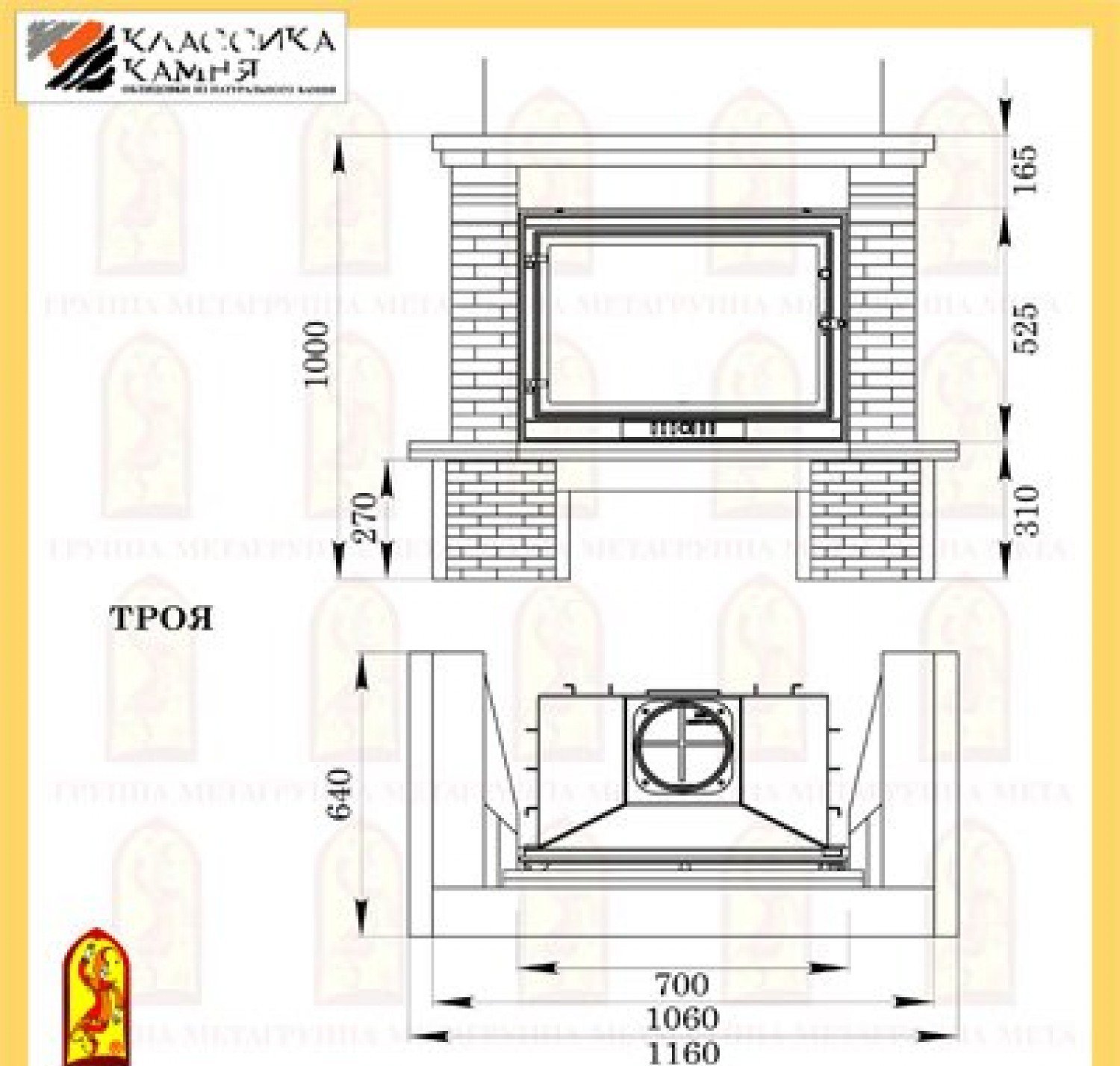 Компактная пристенная каминная облицовка Мета ТРОЯ 705 изготовлена из колотого доломита желтого цвета, натурального мрамора (бежево-серого цвета) с обработкой Антик и камня META Stone™ серо-белого цвета.
