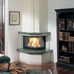 Компактная модель камина Lady Due с плитой из зеленого мрамора Verde Gvatemala, цоколь и боковые части выполнены в бучардированном мраморе Trani.